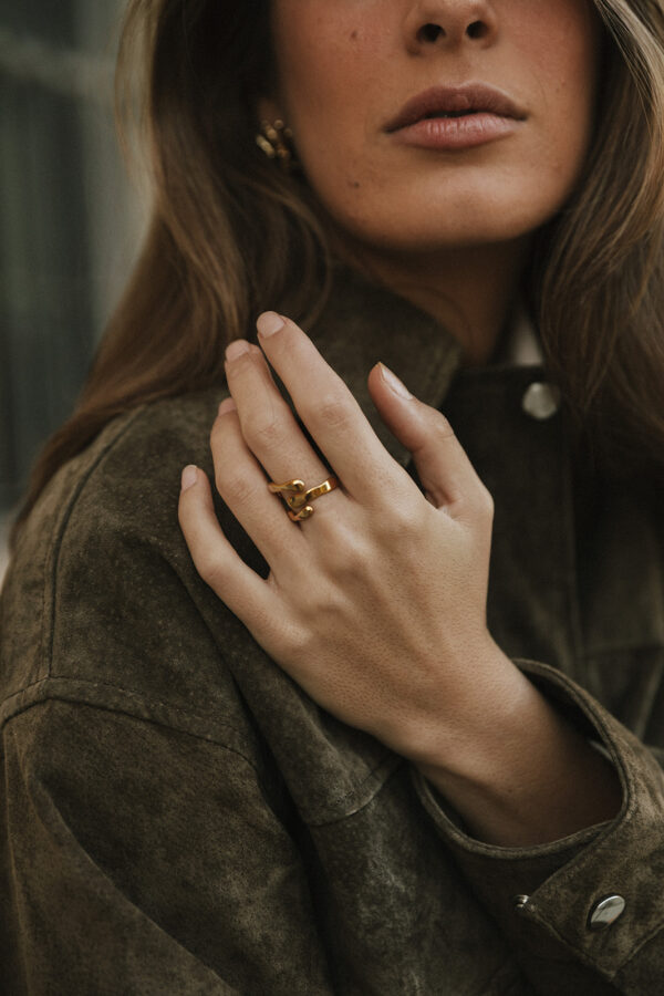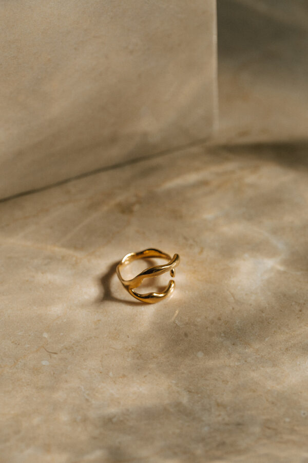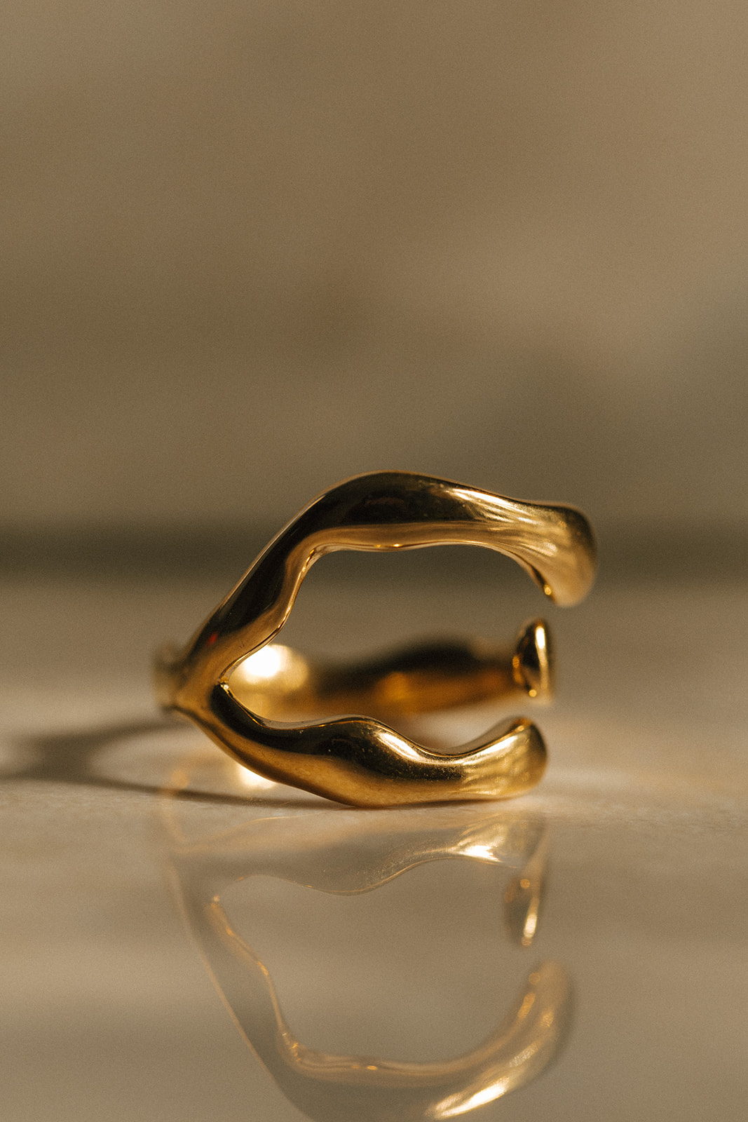 Anillo dorado formado por dos líneas onduladas que se cruzan. El diseño es moderno y cómodo de llevar. Perfecto para uso diario o para combinar con otras piezas.
