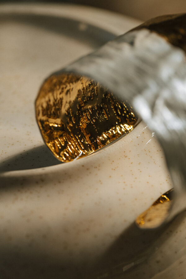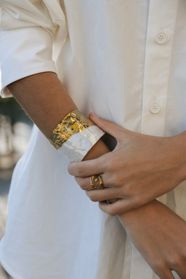 Brazalete ancho con mitad dorada y mitad blanca, creando un contraste marcado.