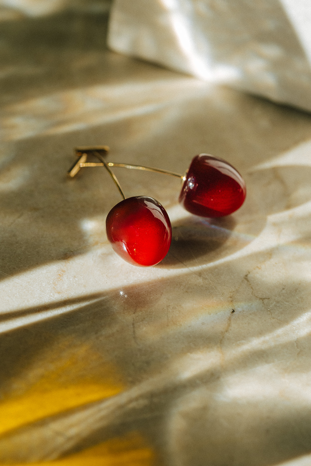Pendientes dorados con una pieza roja pulida en forma de cereza.