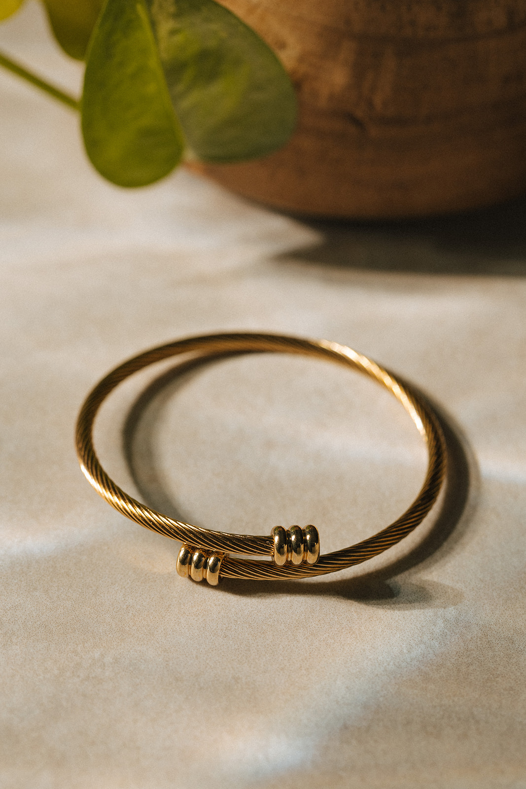 Pulsera rígida dorada con extremos decorados que aportan un toque sutil.